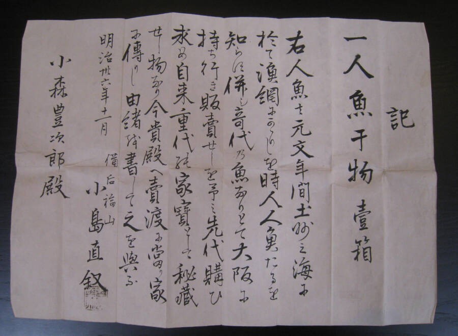 根据这封信,这具木乃伊在 1736 年至 1741 年间的某个时候被渔民捕获并卖给了一个富豪。