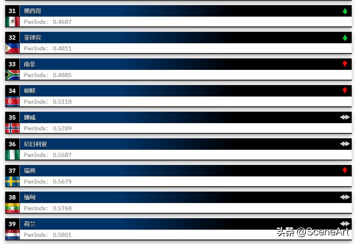 “火力指数”的计算不考虑核武器,所以该榜单是一个常规军力排行榜。一个国家的“火力指数”分值越小,那么该国的军力就越强。韩国排第6、日本在该榜单中排名第8,高于朝鲜的第34,如果考虑核武器,朝鲜的名次会大幅度提升。