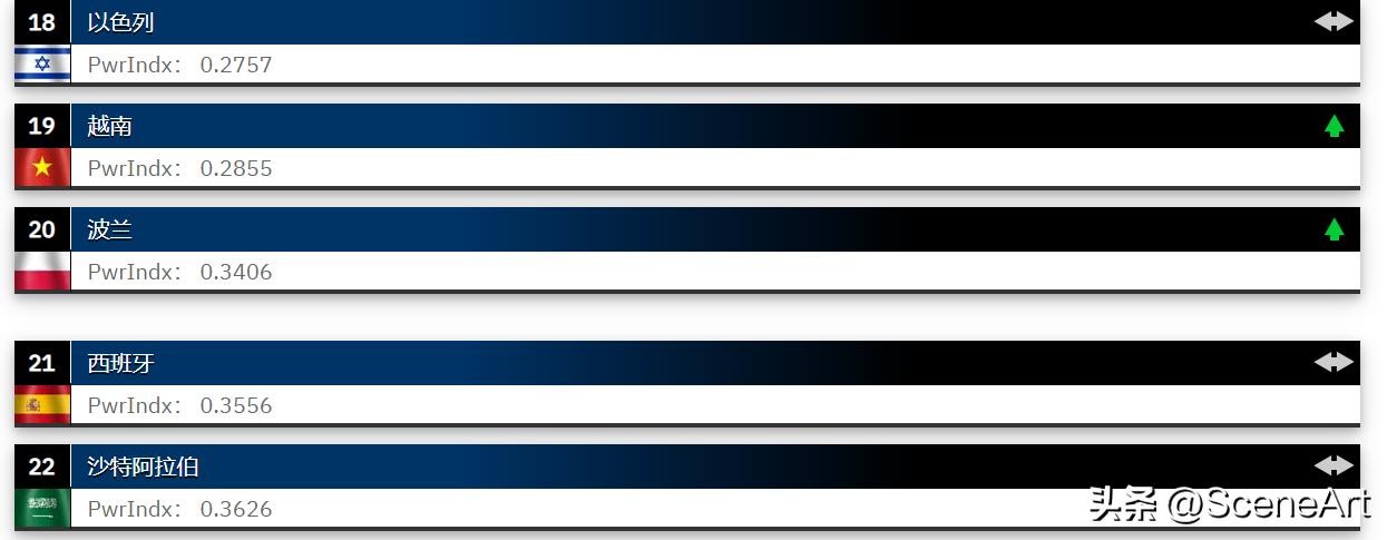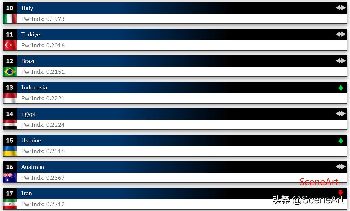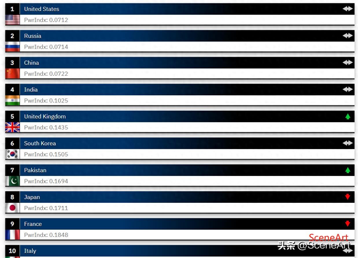 印度以0.1025的火力指数排名第四,英国以0.1435的火力指数排名第五。韩国、法国、日本和巴西也进入了前十名。