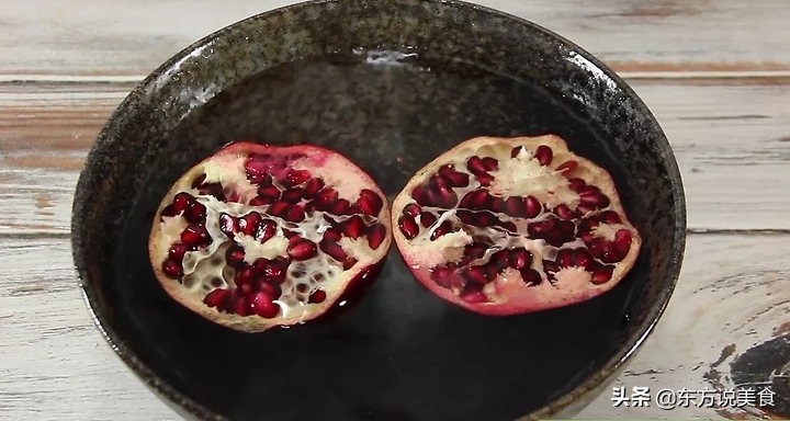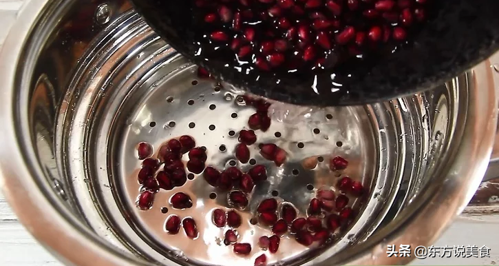 取出石榴籽,然后撇去白髓。然后,慢慢地将水和石榴籽倒在淘米盆中或用漏勺捞出石榴籽。将其放入碗中吃个痛快吧!