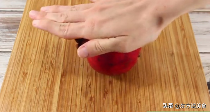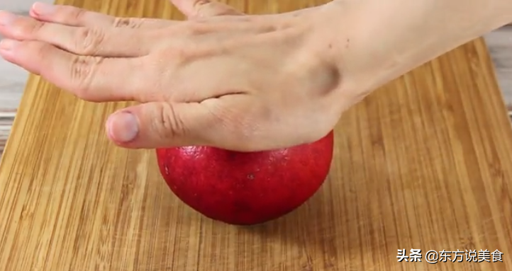 将手展平并将其压在水果顶部。当你将石榴翻过砧板表面时,用力压下石榴。这样可以更容易地去除种子。