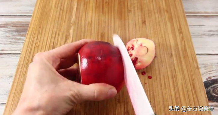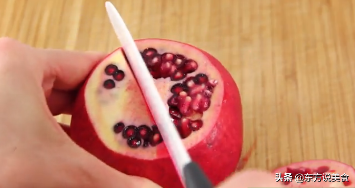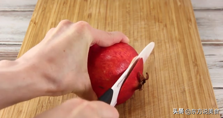 变化:您可能更喜欢切掉石榴的底部,这样每一瓣就不会粘在一起,但是石榴籽容易散落。