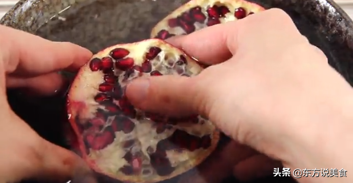 在水中待了几分钟之后,你会看到被称为髓的白色部分。就这样,石榴籽就容易取出来了。