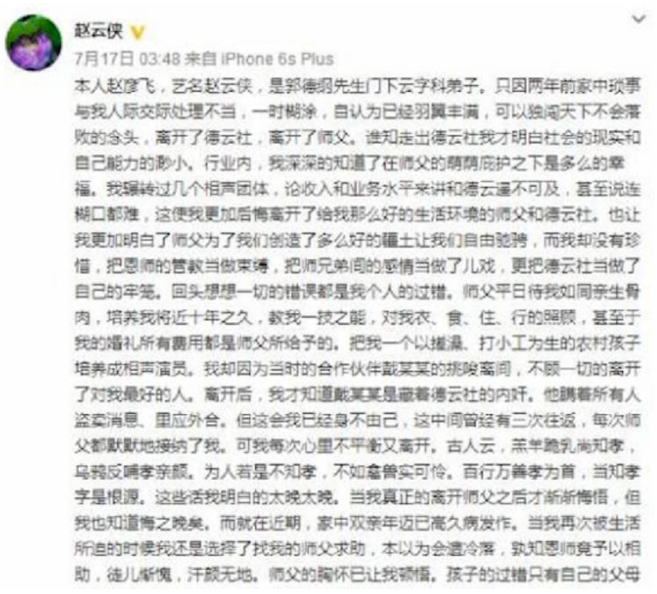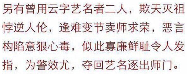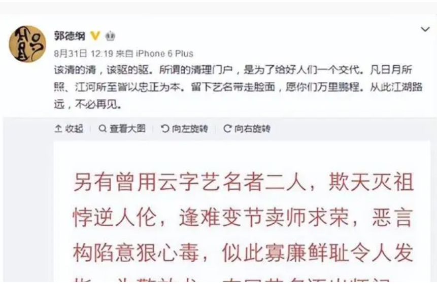 2016年,郭德纲一句“另有曾用云字艺名者二人,欺天灭祖悖逆人伦......为儆效尤,夺回艺名逐出家门......”,郭德纲不仅将两人逐出师门,还拿回艺名。
