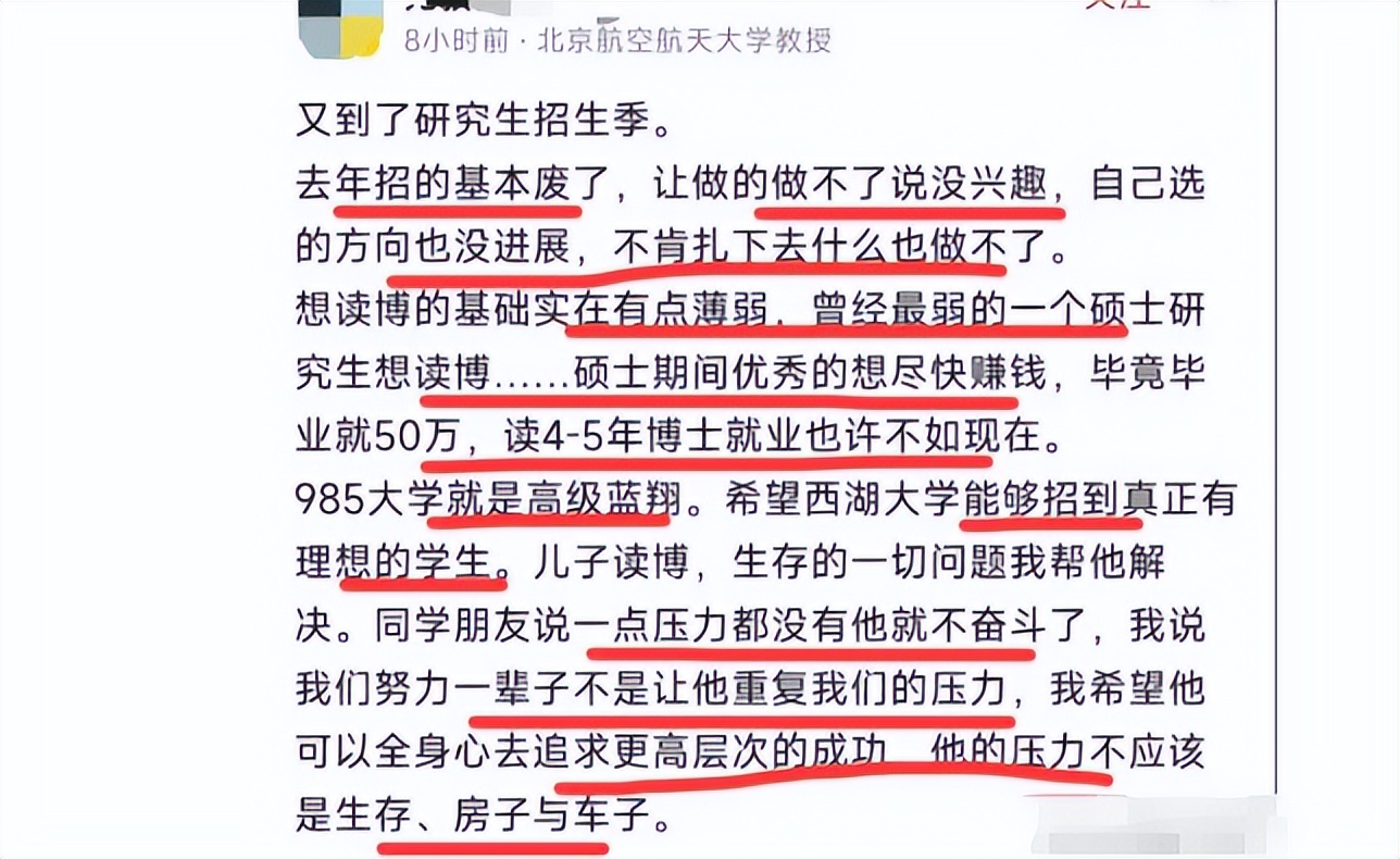 北航教授在今年研究生招生季开始时,在个人社交平台发了这样一段话: