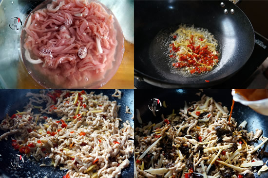 7、锅内加底油烧至6成热,加入姜、蒜、红泡椒炒出香味。将肉丝倒入快速翻炒入味,时间约为20秒。