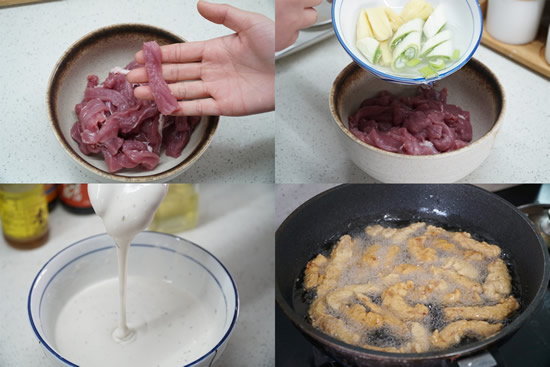 6、将腌制好的里脊肉倒入面糊中,揉抓使里脊肉均匀地挂上浆。锅中加入较多的油,开大火将油温加热至六成热改中小火。