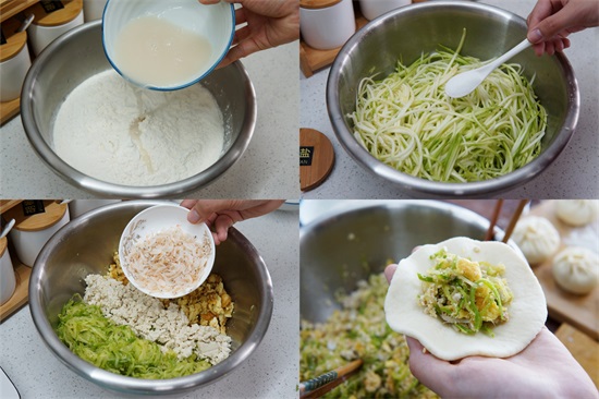 食材:西葫芦、豆腐、鸡蛋、虾皮、面粉、酵母粉、白糖、香油、十三香、鸡精、盐适量。