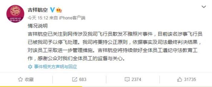 我司飞行员通过网络发布不雅照片事件已引起关注,涉案飞行员已被我司停飞。我公司将秉持公平原则,根据事实和最终司法判决,对该员工采取进一步管理措施。吉祥航空将继续为所有员工遵守法律
