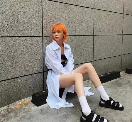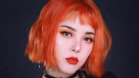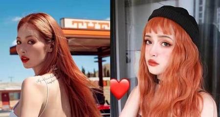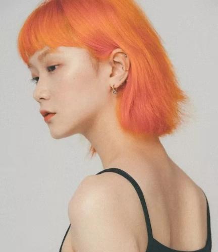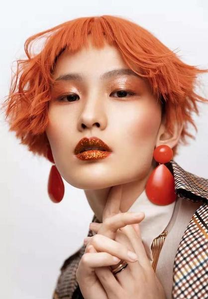 如果中长发染这个发色会,会呈现相当浪漫的少女风格。脏橘发色+脏橘妆容的“双橘”搭配协调又时髦。