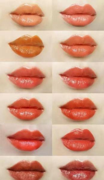 根据不同的场合,不同服饰妆容来配不同明度的橘色口红。