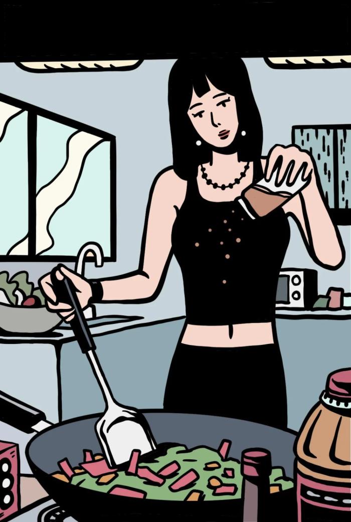 ○ 冰箱里没有冷冻速食,也会尽量避免点外卖。有“番茄炒蛋”之外的拿手菜,可以在1小时内搞定一桌简单的三人餐,在用锅、用刀、用油上都有自己的习惯。