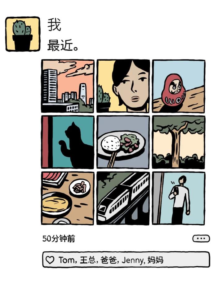 ○ 朋友圈不设分组,也不会特别关注有谁点了赞。九宫格还在发,但不会强行配文,有时只是单纯地想用照片向家人报个平安。