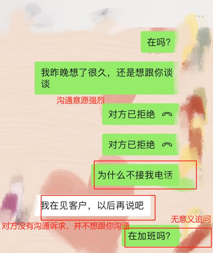 那对方呢?我说直接点,对方在一开始其实是没有沟通诉求的,他甚至可能根本就不想跟你沟通。他作为分手的一方,并没有像你一样强烈的沟通意愿。你可能天天都想跟对方聊天,对方可能根本不想理你。