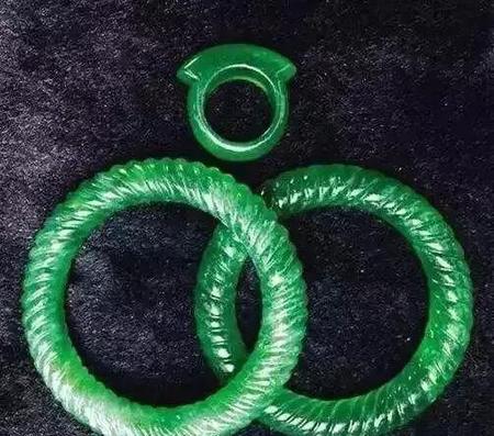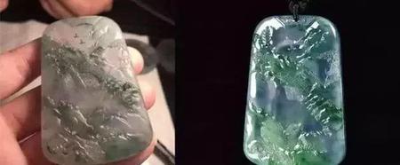 2.覆膜翡翠,行内称“穿衣翡翠”“镀膜翡翠”。现在比较少见了。就是把翡翠放入熔化的特种胶水里“穿上”一层膜,这种胶多为绿色,所以这种方法补水补色又遮丑,但时间一长必露马脚。