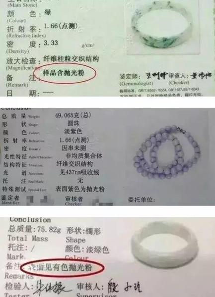 4.大量增添抛光粉的翡翠,行内称“粉重”。成品的最后一道工序是抛光封蜡,正常抛光粉是无填加色的,它的作用是将“毛货”翡翠表面打磨得细腻平整。