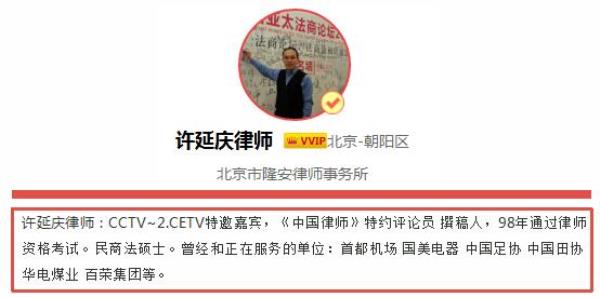 许延庆律师:CCTV~2.CETV特邀嘉宾,《中国律师》特约评论员 撰稿人,98年通过律师资格考试。民商法硕士。曾经和正在服务的单位:首都机场 国美电器 中国足协 中国田协 华电煤业 百荣集团等。