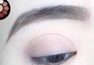 用哑光藕粉色在靠近睫毛根部位置,画一般,不要超过刚刚打底的颜色