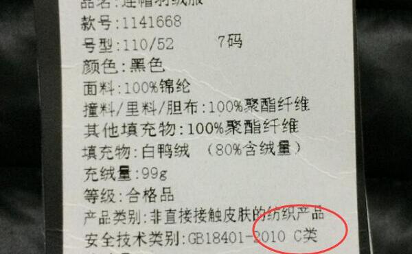 衣服标牌上会有安全类别,分abc类。其中a类是指婴幼儿的用品,包括婴儿的内衣,安全级别最高;b类是指可以接触皮肤的产品,像贴身内衣等;c类是指非直接接触皮肤的产品,像外衣、围裙、羽绒服等,是不可以直接接触皮肤的。对此,大家可以看看羽绒服是c类可以穿吗。