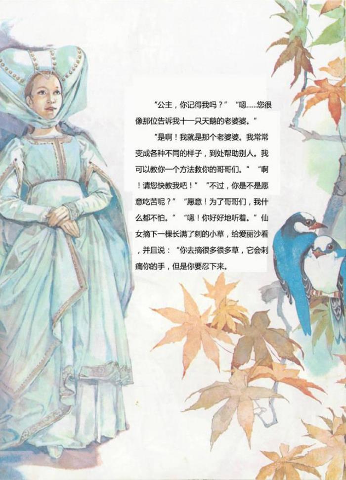 艾丽莎的11个哥哥都被后母变成了野天鹅,艾丽莎必须用有刺的荨麻编织11件长袖的披甲穿到11只野天鹅的身上才能把他们身上的魔力解除,并且在这个过程中,她不能说一句话。