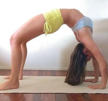 不知道大家掌握了轮式体式的动作要领了吗?那么就和小密一起再做另外的体式吧。我们在平躺在瑜伽垫上之后,将自己的腿部抬高并绕过头部让脚紧蹬地面并让自己的身体与地面呈现垂直状态就能够达到体式的标准要求了。