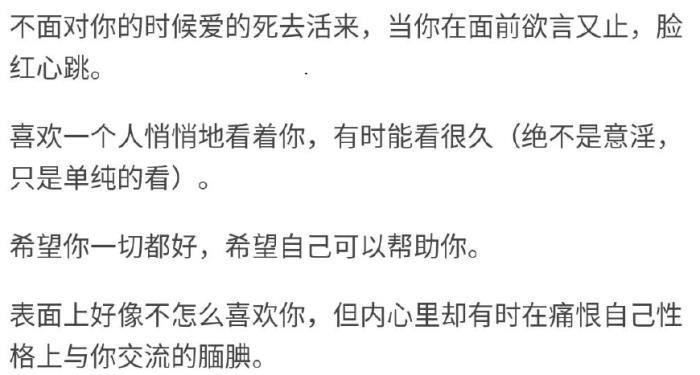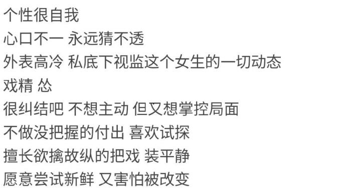 视奸朋友圈,从来不留言。一直盯着她,转头看地下。网上话很多,见面就尴尬。独处会紧张,脸红摸头发。默默做很多,从不告诉她。脑补一辈子,却不敢说话。表面高冷男,内心骚到家。不喜欢主动,等你靠近他。谈恋爱前闷,谈恋爱后骚。闷得像头牛,骚得真可怕。