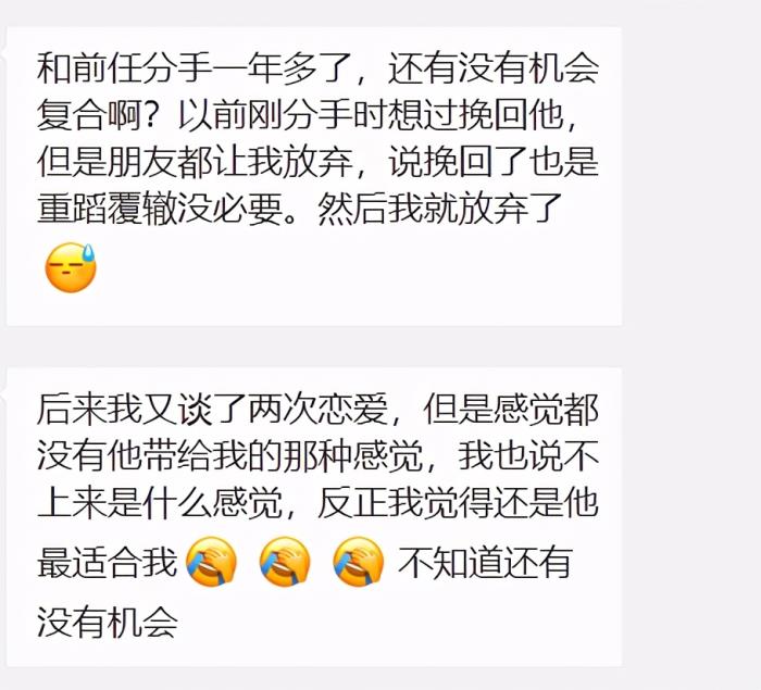 ▶来访者B和A不同的是,B和前任分手一年多了,当初在大量好友的劝说下放弃了挽回。可时隔多年,还是忘不掉对方: