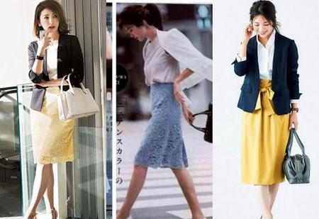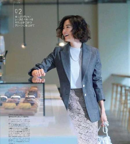 小西装搭配蕾丝半裙,柔美的蕾丝裙柔和了西装的硬朗,内搭白T恤,简约充满质感,搭配一条针织项链,精致感一下上升。