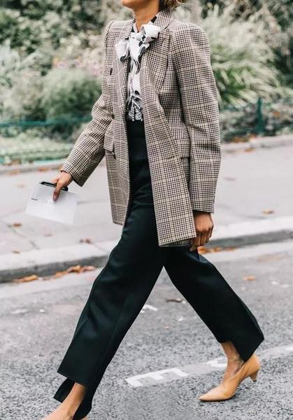 灰色格纹西装搭配波点系带衬衣,很有一番干练气息,但又觉得天甜美,搭配 不规则的黑色长裤,配上尖头平底鞋,尽显时尚范。