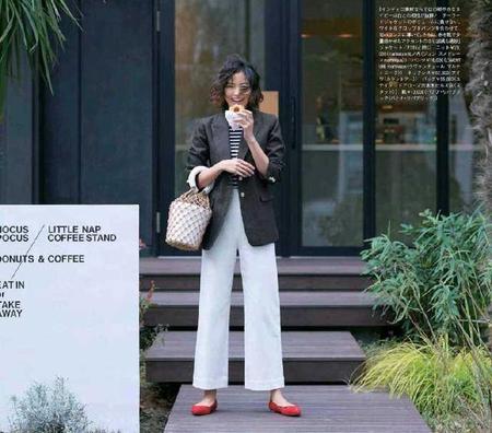 黑灰色西装内搭条纹上衣,增添一点法式小情调,搭配白色阔腿长裤,用红色平底鞋点缀,稳重大气又有一点小心机。