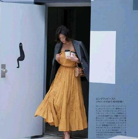 小西装一般以深色几多,搭配亮色系的单品,时尚又充满气场,比如黄色高腰裙摆连衣裙,领口镂空的设计,淡淡的女人味,搭配灰色小西装,明艳动人,又高级。