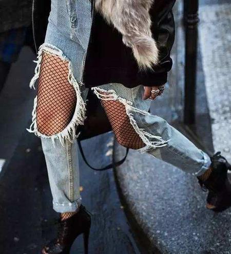 虽然破洞牛仔裤不是这两年最受时尚达人追捧的款式,但一直存在于时尚界,而且很多小姐姐喜欢在里面叠穿渔网袜。既满足了想穿渔网袜却担心过于轻佻的需求,也能让破洞牛仔裤穿出不一样的潮流感与个性。