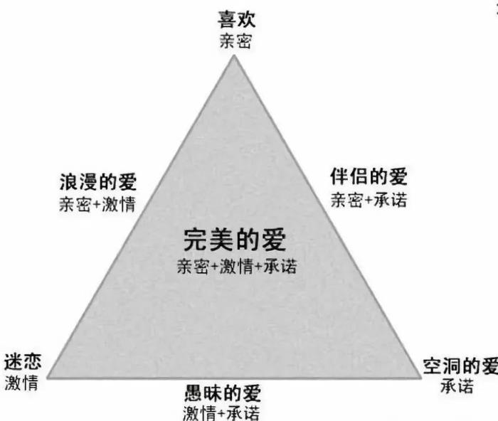 关键就在心理学家斯滕伯格提出的著名爱情三元素模型,即激情、承诺,以及亲密上。