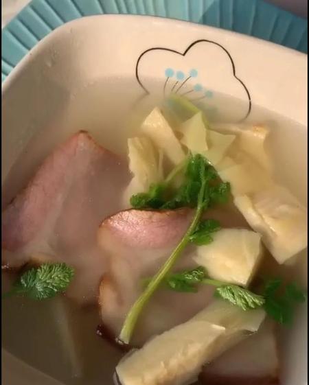 5、腌笃鲜:腊肉切大片或块(也可加入少许排骨),下入清水加姜片煮20分钟,下入处理好的三峡雷笋段,转小火,炖大约一个小时。出锅前,撒葱花胡椒粉即可。