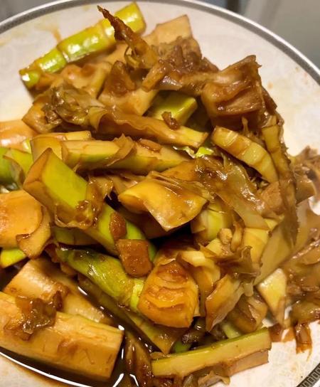 3、油焖春笋超级好吃!用点荤油,加白酒、生抽、老抽、冰糖一起焖,收汁前放点醋,超级美味超级嫩!