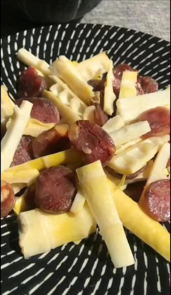 4、雷笋炒腊肠:雷笋剥皮焯水后切段,阿赐酱腊肠切薄片,锅烧热后放入腊肠片煸炒出油后下入雷笋,中火翻炒三分钟后撒少许盐、胡椒粉、香葱起锅即可。